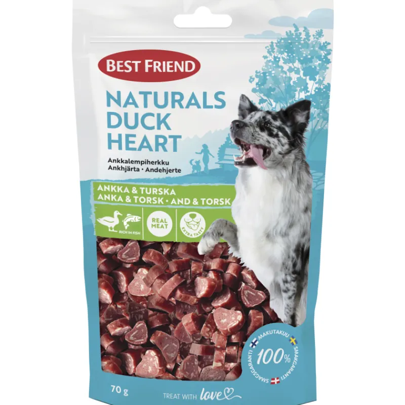Suloinen, sydämenmuotoinen Best Friend Naturals Duck Heart -ankkalempiherkku sisältää runsaasti ankanlihaa. Herkullinen turska lisää maistuvuutta ja hyviä rasvoja. Maukas ja pienikokoinen makupala sopii erinomaisesti välipalaksi ja koulutukseen.