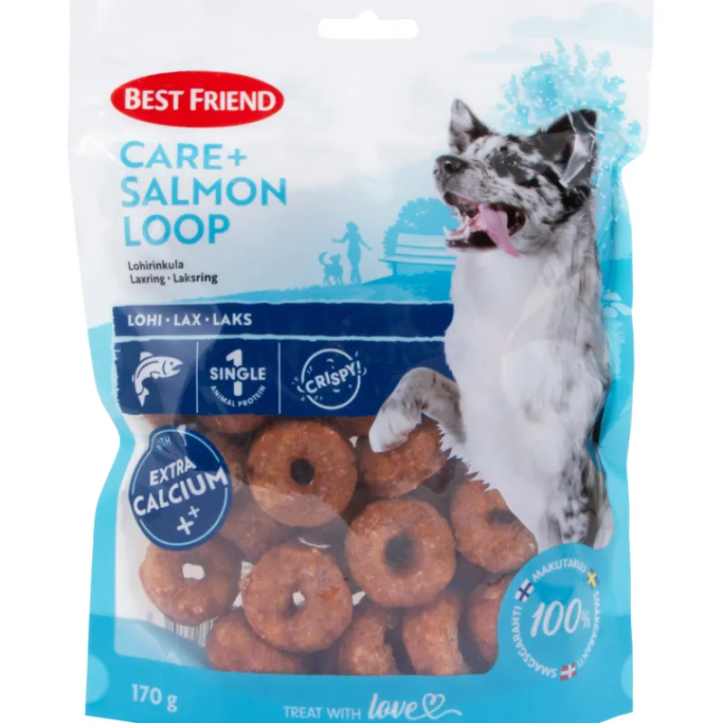 Pieni donitsin muotoinen Best Friend Care+ Salmon Loop -lohirinkula on hauska ja rapea herkku. Makupala sisältää runsaasti kuitupitoista bataattia ja perunaa, jotka ovat hyväksi ruoansulatukselle. Lisätty kalsium auttaa tukemaan koiran yleistä hyvinvointia. Lohi takaa suussa sulavan maun, jota koirat rakastavat.