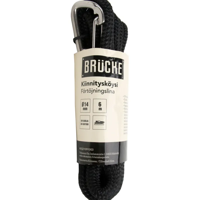 Laadukas ja säänkestävä 24-säikeinen kiinnitysköysi haponkestävällä AISI316 karbiinihaalla. Materiaali polyesteriä. Mitat: 14 mm x 6 m. UV-suojattu, uppoava, BS 1000 kg. Väri musta.