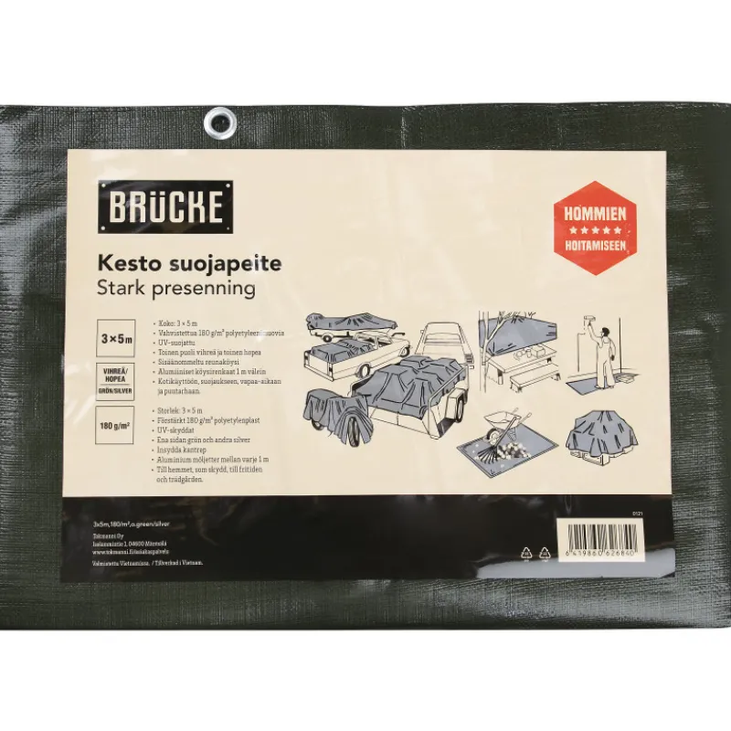 Brücke-suojapeite sopii monenlaiseen käyttöön. Peite soveltuu hyvin esimerkiksi suojaukseen, kotikäyttöön, vapaa-aikaan ja puutarhaan. Suojapeitteen toinen puoli on vihreä ja toinen hopea.