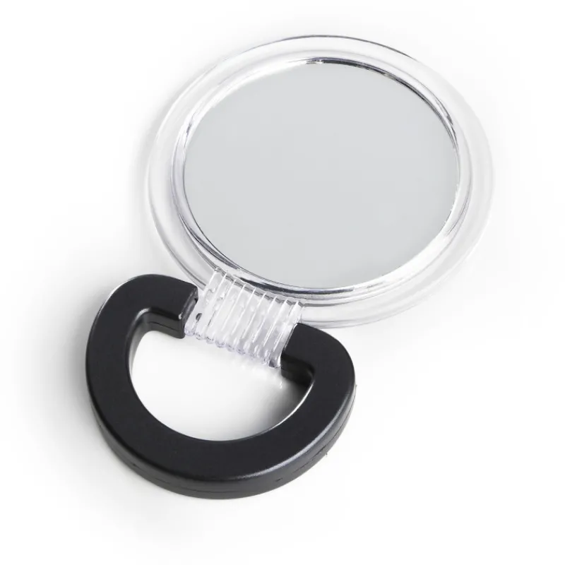 Kaksipuolinen peili, jonka toinen puoli on normaali ja toinen 2x suurentava. Peiliosan halkaisija on 7 cm. Monikäyttöinen peili toimii taitettavan kädensijan ansiosta sekä käsi- että pöytäpeilinä. Sen voi myös ripustaa seinälle.