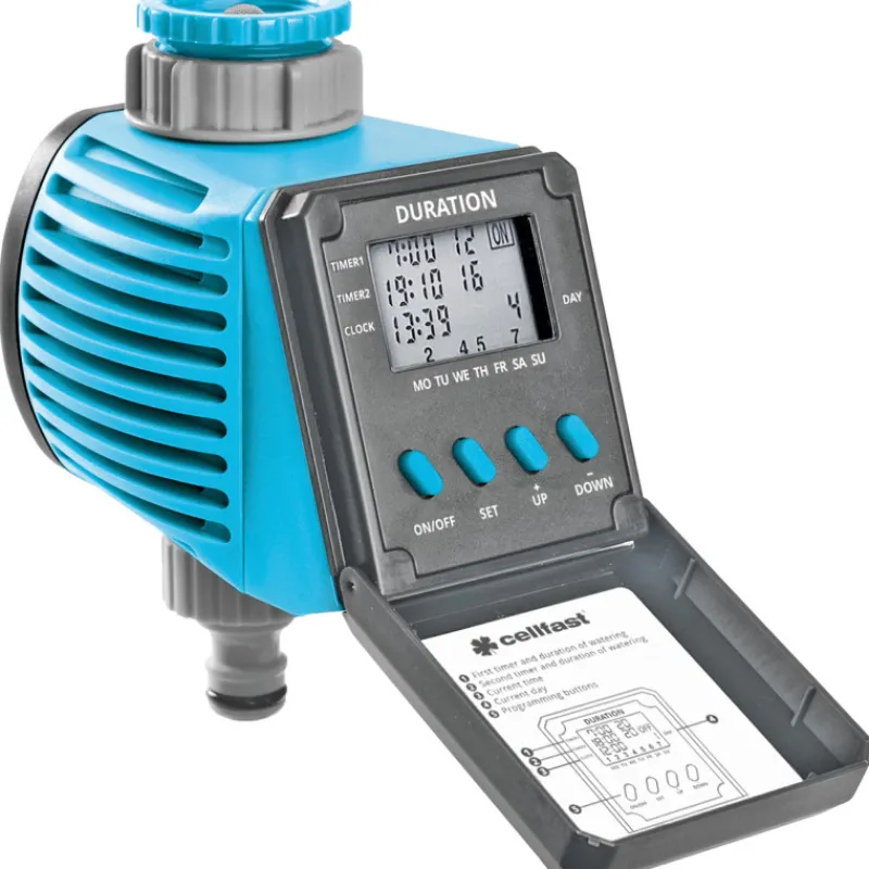 Helppokäyttöinen digitaalinen Cellfast-ajastin pihan ja puutarhan kastelun avuksi. Toiminta-aika on mahdollista säätää automaattiseksi tai manuaalisesti ja eri päiville voi asettaa erilaiset kasteluajat.