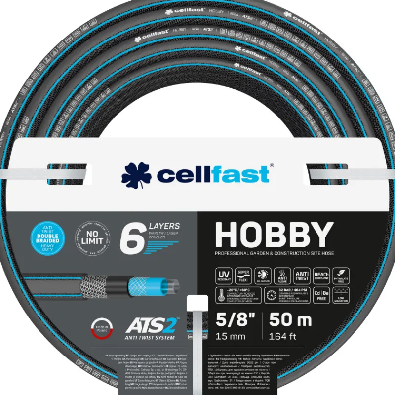 Elintarvikehyväksytty kiertymätön kuusikerrosletku. Cellfastin ATS2 double cross trikoo vahvistukset letkussa. UV-suojattu. Erittäin kestävä ja melko taipuisa. Käyttölämpötila -20 – +60°C. Letkun pituus 50 m.