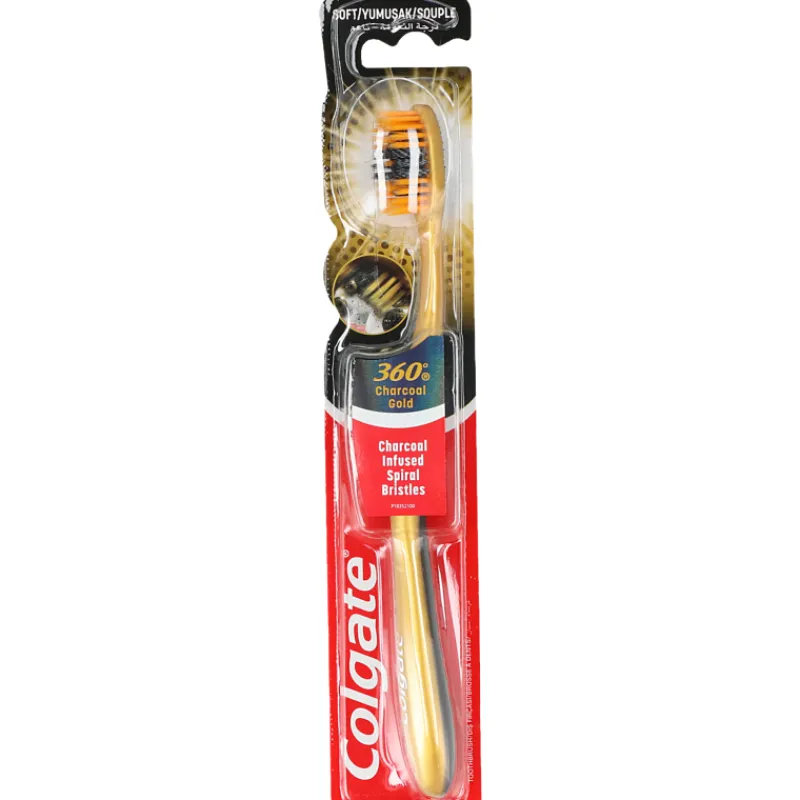 Colgate 360° Charcoal Gold Soft -hammasharja puhdistaa koko suun. Soft-malli eli pehmeä harjasosa.