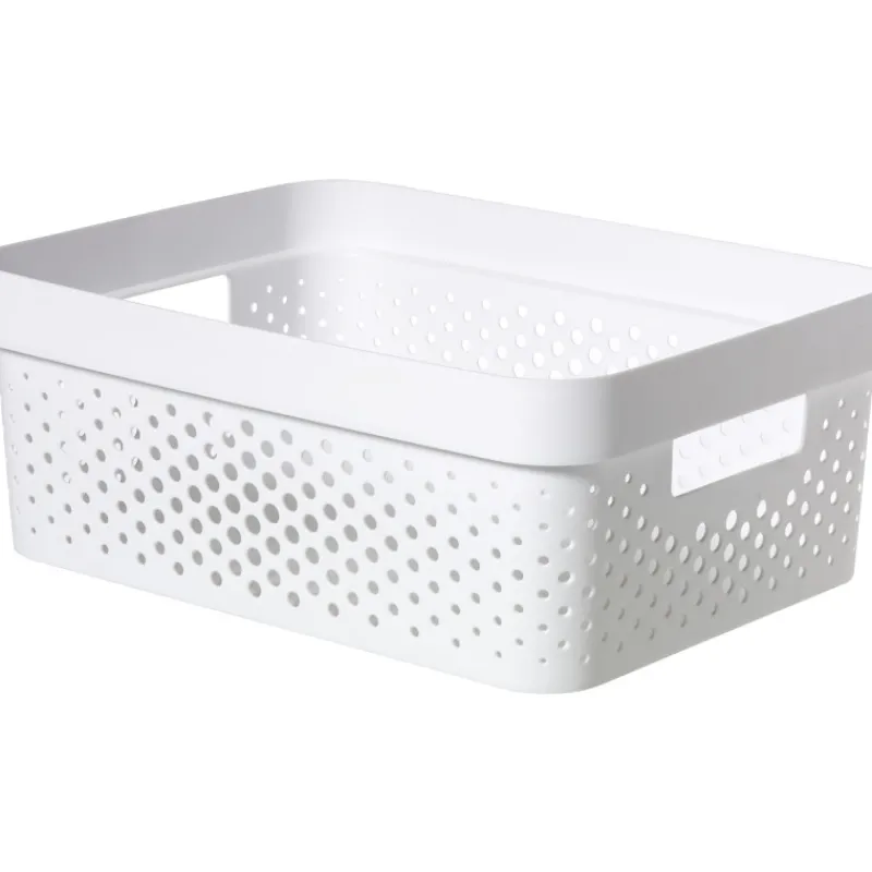 Curver Infinity Dots-säilytyskorissa pysyvät pikkutavarat järjestyksessä ja tallessa. Kierrätysmuovista valmistetun säilytyskorin vetoisuus on 11 L, koko 13,6 x 26,6 x 35,6 cm. Reilunkokoiset kantokahvat molemmissa päädyissä. Pilkkukuviointi, väri tummanharmaa tai valkoinen.