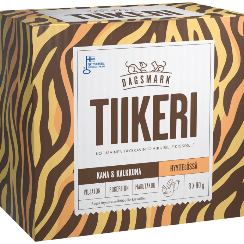 Dagsmark Tiikeri on kotimainen kissan täysravinto, joka tukee kissan hyvinvointia. Ravinnossa on maistuva ja proteiinipitoinen koostumus. Ruoka sisältää suomalaista maistuvaa kanaa ja kalkkunaa hyytelössä. Ruoka sisältää kaikki tärkeät kivennäisaineet sekä vitamiinit. Ei sisällä viljaa, soijaa, lisättyä sokeria, säilöntä- tai väriaineita.
