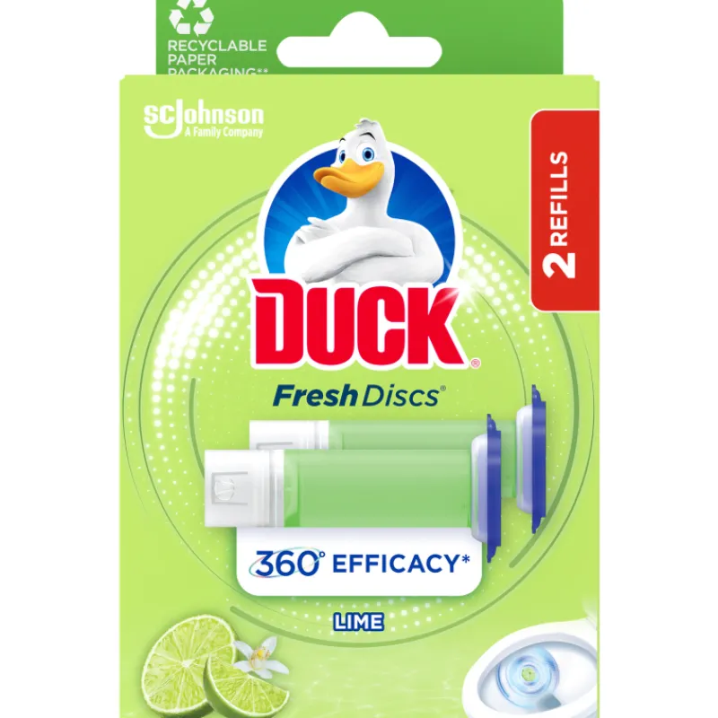 Duck Fresh Discs on hygieeninen WC-raikastin, joka ei sisällä lainkaan pöpöjä keräävää pidikettä. Tuote muodostaa vain yhdellä painalluksella itsekiinnittyvän geelimäisen ruusukkeen, joka kiinnittyy niin kosteaan kuin kuivaankin pintaan. Ainutlaatuinen ruusuke raikastaa ja puhdistaa tehokkaasti jokaisella huuhtelulla, samalla ehkäisten myös kalkin muodostumista. Tuoksuna raikas lime.