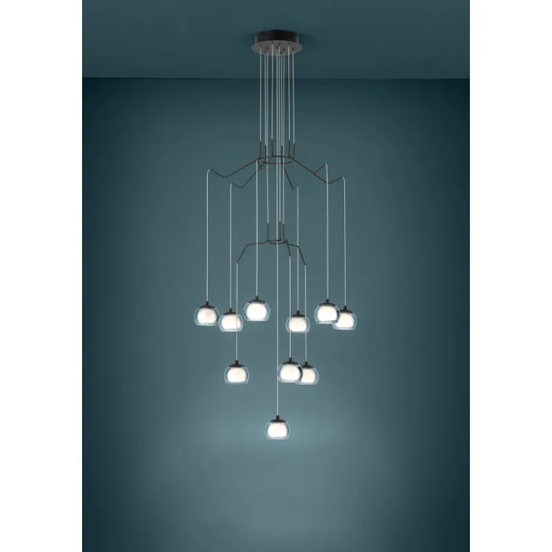 Upea riippuvalaisin, jossa 10 savulasista pallomaista varjostinta roikkuu eri korkeuksilla. Valaisimen 10×3,3W ledit tuottavat kauniin lämmintä, valkoista valoa (3000K). Kiinnitys kattopintaan, sokeripalaliitäntä. Vain sisäkäyttöön, IP20. Mitat: 67x67x166cm.