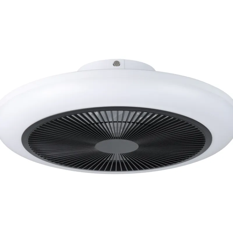 Kompakti valkoinen/harmaa LED-tuuletinvalaisin, jossa tuulettimen lavat ovat piilossa ritilän takana. Modernissa tuuletinvalaisimessa integroidut LEDit (4 x 5,2 W) kiertävät tuuletinosion ympäri ja niiden tuottaman valkoisen valon sävyä sekä kirkkautta on helppo säätää mukana tulevan kaukosäätimen avulla. Tuulettimessa on 3 nopeutta. Kiinnitys kattopintaan, sokeripalaliitäntä. Vain sisäkäyttöön, IP20. Mitat 46 x 15 cm.
