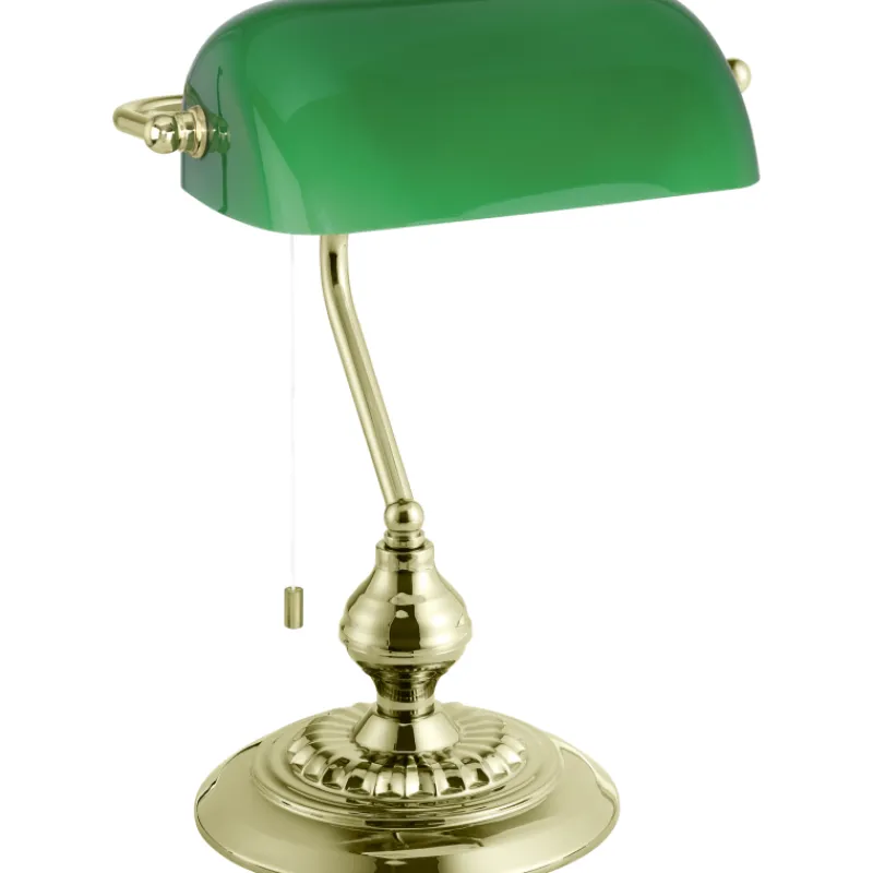 Pöytävalaisimien klassikko, vihreällä lasikuvulla ja messinginvärisellä vetokytkimellä varustettu upea katseenvangitsija työpöydälle. Vaatii E27-kantaisen polttimon maks. 60W, joka ei sisälly pakkaukseen.