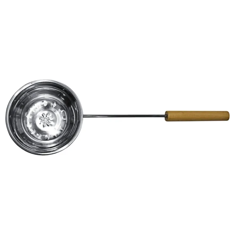 Emendon tyylikäästi muotoiltu teräksinen löylykauha. Puinen käsiosa ei kuumene.