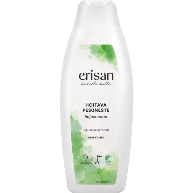 Hoitava Erisan pesuneste puhdistaa koko perheen ihon hellävaraisesti. Sen hoitavat ja suojaavat ainesosat säilyttävät ihon normaalin kosteustasapainon. Ainesosat ovat tutkittuja ja turvallisia. Tuote soveltuu usein toistuvaan pesuun.