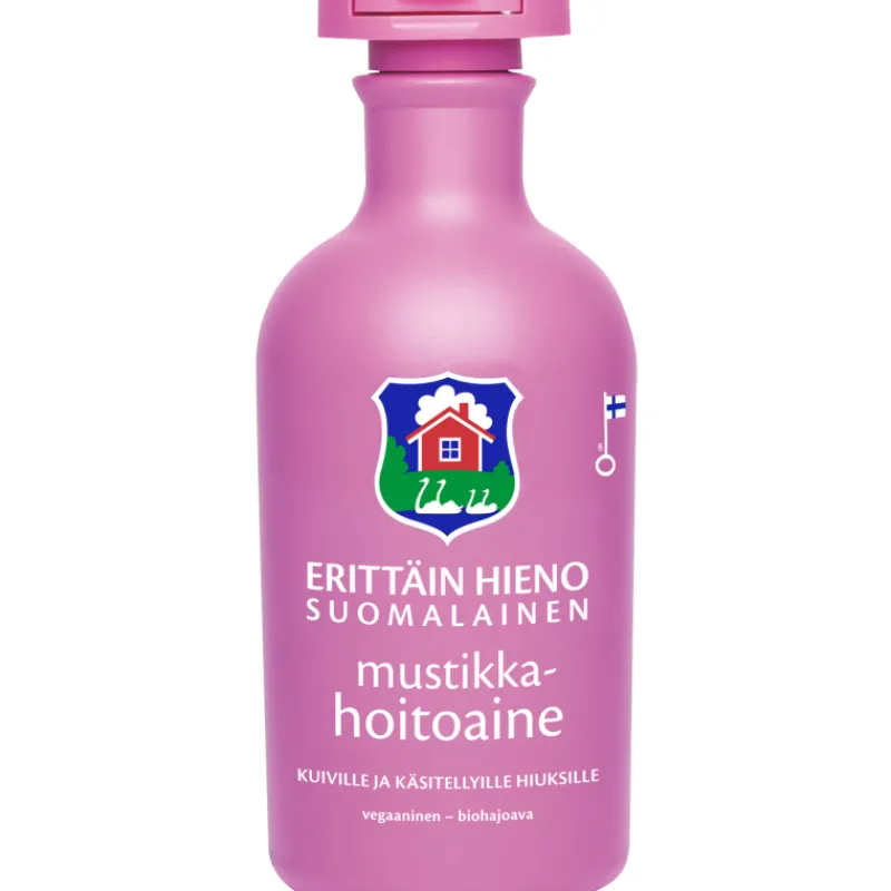 Erittäin Hieno Suomalainen mustikkahoitoaine sisältää aitoa, suomalaista mustikkauutetta. Mustikka sisältää muun muassa A- ja B-vitamiineja, mangaania, kuituja ja flavonoideja. Mustikkahoitoaine sopii erityisesti täydentämään Erittäin Hienolla Suomalaisella shampoolla pestyjen hiusten hoitoa. Kuiville ja käsitellyille hiuksille.