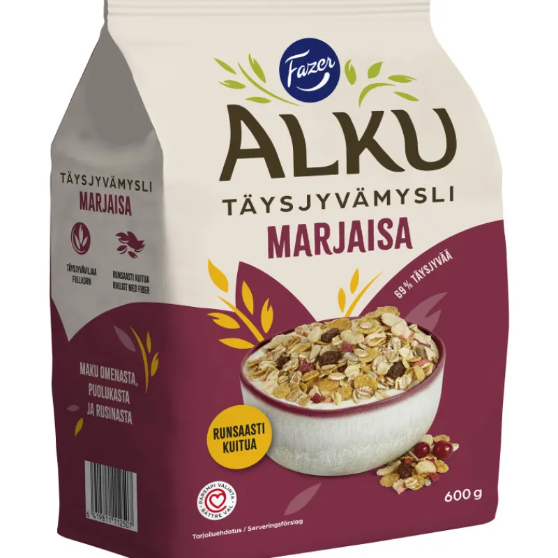 Herkullisen makuinen Fazer Alku marjaisa -täysjyvämysli sisältää ihania marjoja ja hedelmiä. Rapean täysjyvämyslin pirteä maku syntyy lempeän täysjyvä- kauran, rukiin, vehnän ja ohran sekä puolukan, omenan ja rusinan yhdistelmästä. Marjaisa runsaskuituinen täysjyvämysli sopii nautittavaksi esimerkiksi maidon, jogurtin tai kaurajuoman kanssa.