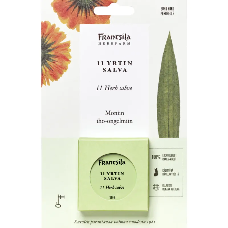 Perinteinen Frantsilan 11yrtin salva uudistaa ja rauhoittaa ihoa. Erilaisiin ihon ongelma kohtiin sopiva salva sisältää 11 yrttiä, joita suomalainen perinteinen kansanlääkintätaito ja nyky-kasvitutkimus arvostavat tehokkaina ihorohtoina.