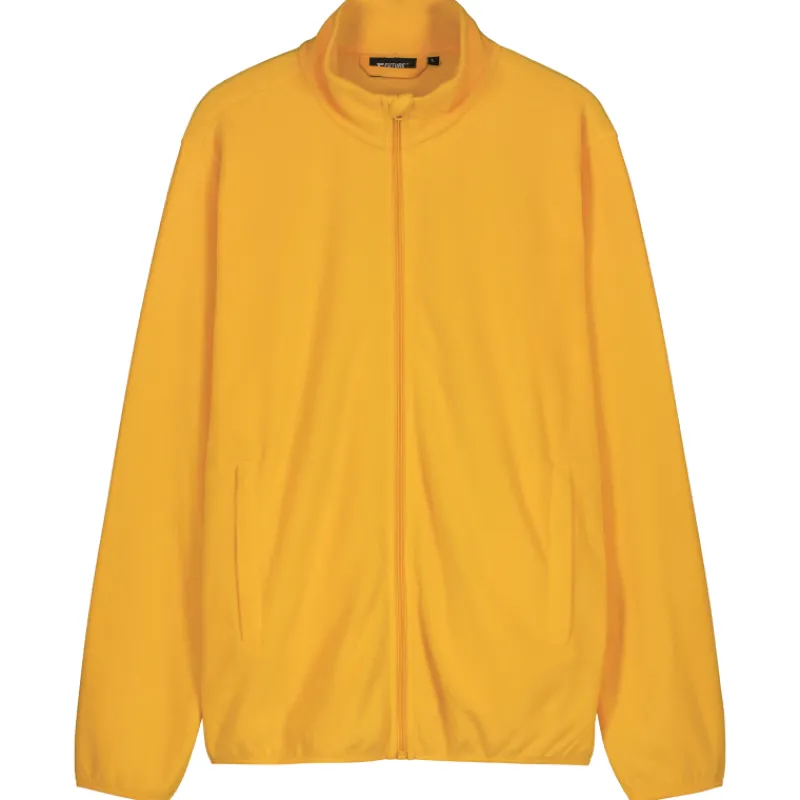 Väljän mallisessa fleecetakissa on pystykaulus ja molemmilla sivuilla vetoketjutaskut. Yksivärinen kuosi, väri keltainen. Paljon kokoja – isoin koko 3XL (64/66).