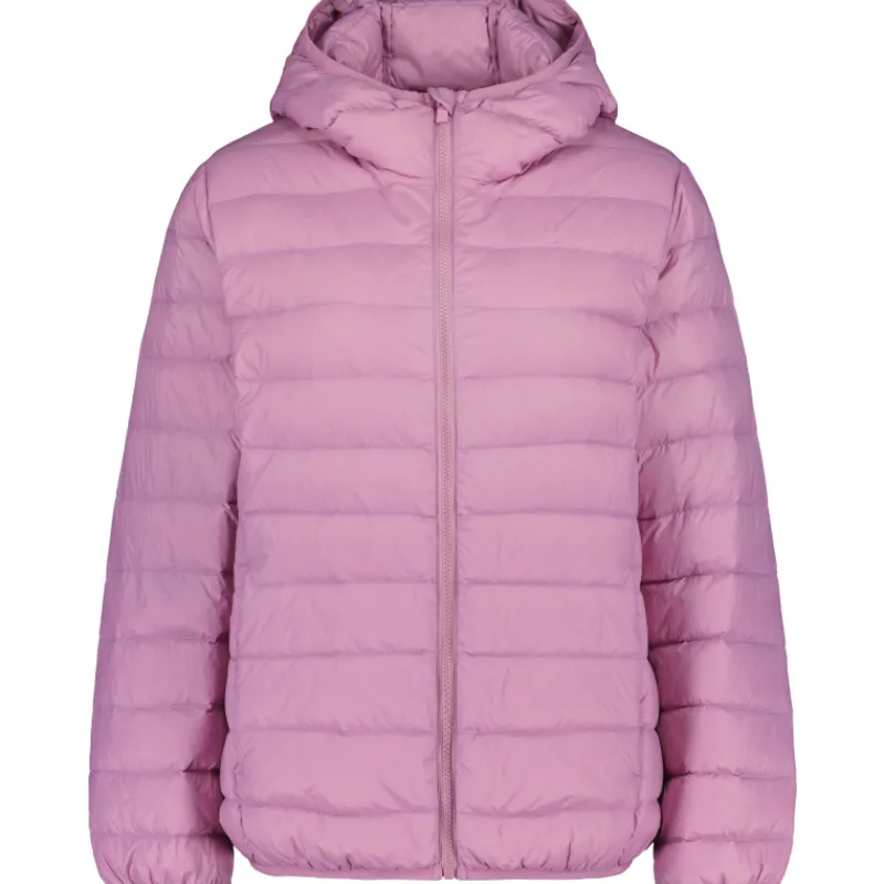 Vaakatikattu naisten kevytuntuvatakki, jossa lyhyt, hupullinen ja kätevästi konepestävä malli.