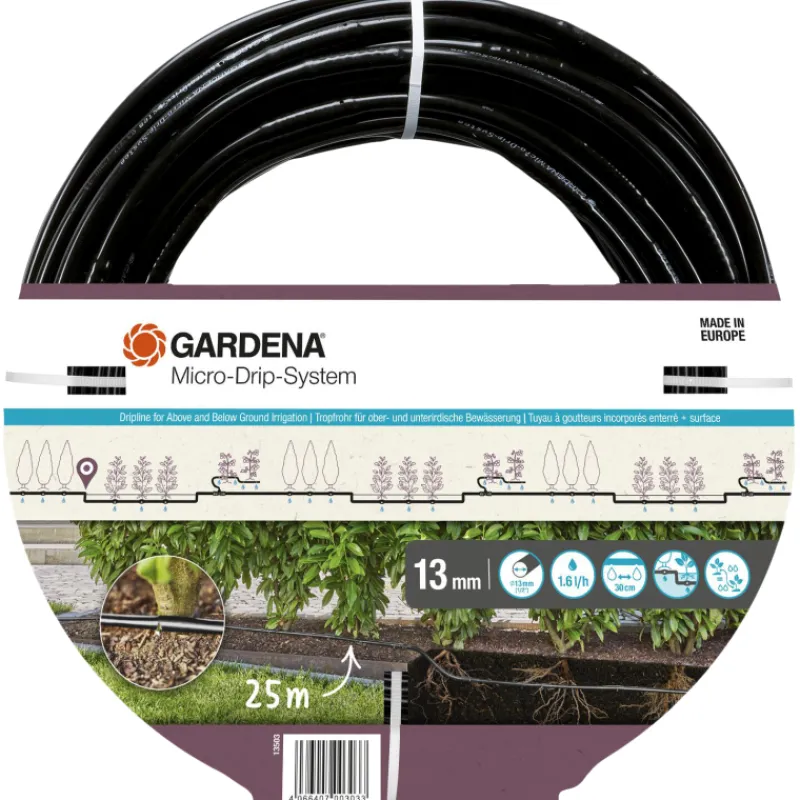 Vettä säästävien, integroitujen tippusuuttimien (1,6 l/h) ansiosta GARDENAn Micro-Drip-laajennussarja pensasaidoille mahdollistaa jopa 25 m pitkien kasvirivien, kuten tuija-aidan kastelun maan päältä tai maan alta. Helposti asennettava tippukasteluletku on jatko-osa pensasaidoille tarkoitettuun Micro-Drip-kastelusarjaan (tuotenumerot 13500-20 ja 13501-20). Se voidaan sijoittaa joustavasti maan päälle tai maan alle pois näkyvistä. Itsepuhdistuvan labyrinttitekniikan ja juurisuojan ansiosta tippukasteluputki ei tukkeudu. Integroidut tippusuuttimet on sijoitettu 30 cm:n välein, ja ne tarjoavat tasaisen vedenjakelun 1,6 litraa vettä tunnissa per suutin. Koska suuttimet ovat painetta tasaavia, ne selviävät myös korkeuseroista esimerkiksi rinteessä. Patentoidulla Quick & Easy -liitäntätekniikalla varustettujen erikseen saatavien 13 mm:n liittimien avulla letku voidaan haaroittaa nopeasti ja helposti eri suuntiin. MDS-komponentit eivät vaurioidu toistuvankaan käytön jälkeen, ne ovat uudelleenkäytettäviä ja siten tukevat kestävää kehitystä yhdessä vettä säästävän kohdennetun tippukastelun kanssa.