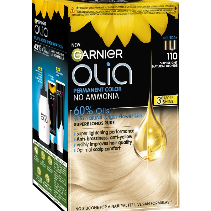 Loreal Garnier Olia 110 Super Blonds on kirkkaan vaalea kestoväri, taistelee keltaisia ja oransseja vivahteita vastaan. Toisin kuin perinteisissä hiusväreissä, Oliassa on 60 % öljyseosta, joka tekee hiuksista samettisen pehmeät. Ei sisällä ammoniakkia.