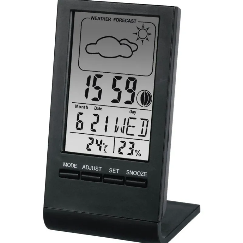 Hama TH-100 -lämpö- ja kosteusmittari on täynnä informaatiota: lämpötilan ja ilmankosteuden lisäksi se kertoo myös kellonajan, viikonpäivän, päivämäärän, sääennusteen ja kuunkierron vaiheen.