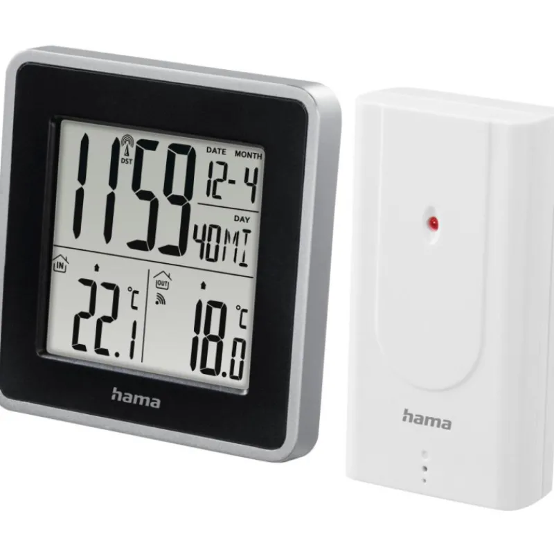 Langattomalla ulkoanturilla ja DCF-radiokellolla varustettu Hama EWS Intro -sääasema näyttää sisä- ja ulkolämpötilan sekä kellonajan, päivämäärän ja viikonpäivän. DCF-radiokello asettuu aina automaattisesti oikeaan aikaan.