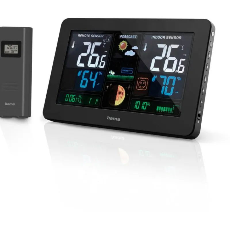 Helppokäyttöinen, tyylikäs ja käytännöllinen Hama Premium -sääasema värinäytöllä näyttää kaiken tarpeellisen tiedon sääennusteesta, ajasta, päivämäärästä, kuun vaiheesta, sisä- ja ulkoilman kosteudesta sekä huoneen ilmanlaadusta. USB-portti mahdollistaa puhelimen latauksen.