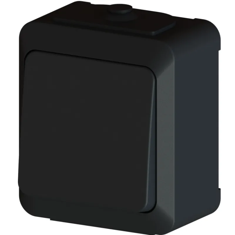 Harju Hiili-sarjan mattamusta pinta-asennettava roiskevesitiivis 1/6 kytkin, joka sopii kosteisiin tiloihin ja ulkokäyttöön. Kytkentä ruuviliittimin. Kotelointiluokka on IP44.