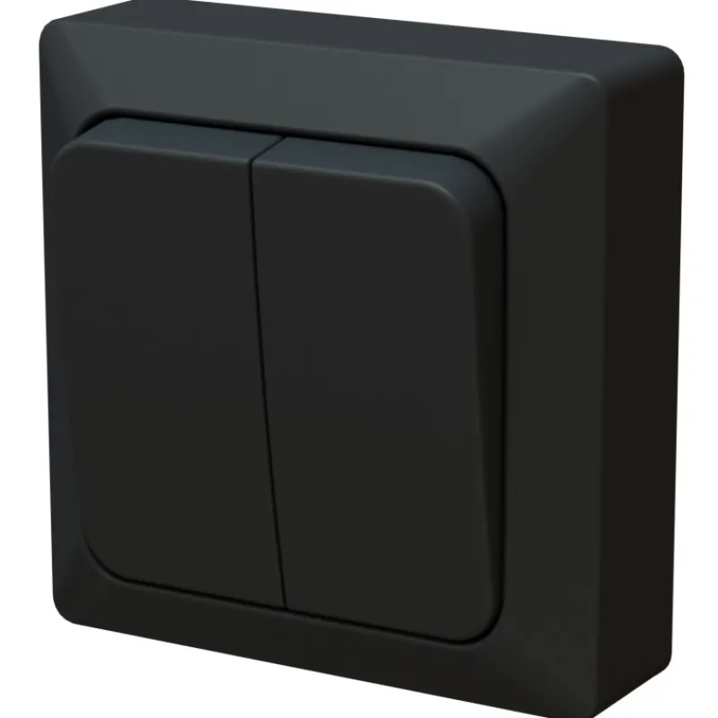 Harju Hiili-sarjan mattamusta pinta-asennettava kruunukytkin kuiviin tiloihin. Kytkentä ruuviliittimin. Kotelointiluokka on IP20.
