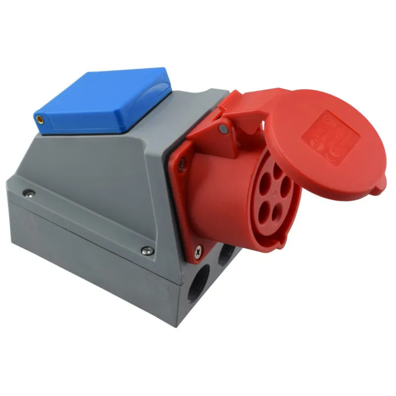 5-napainen 16 A pistorasia ja maadoitettu yksivaiheinen 16 A pistorasia. Roiskevesitivis.
