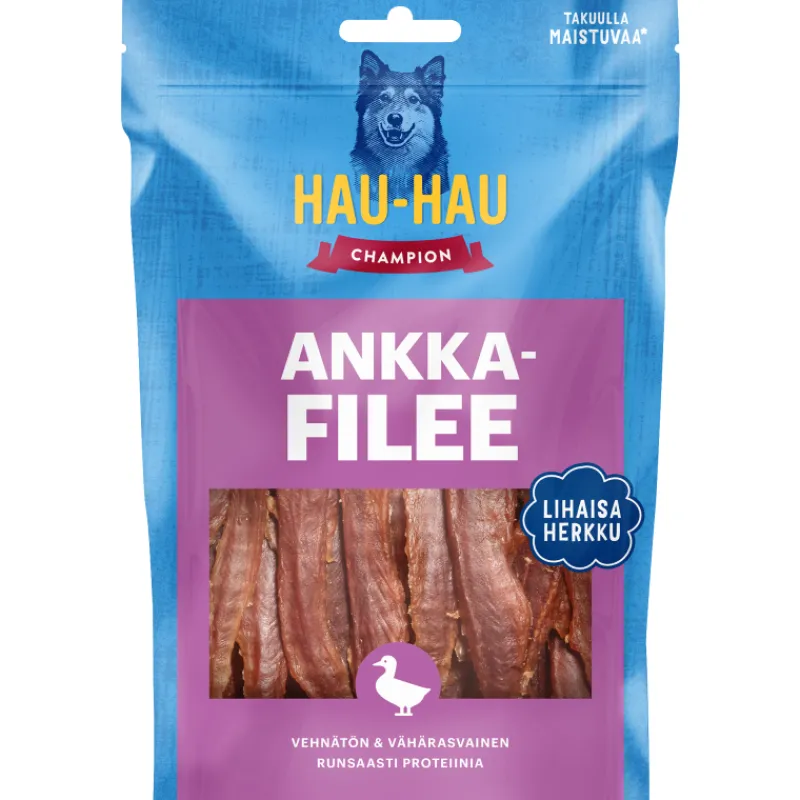 Hau-Hau Champion -ankkafilee on lihaisa koiranherkku, joka soveltuu niin herkutteluhetkiin kuin palkkioksikin. Luontaisesti vähärasvainen makupala voi olla erinomainen makupalavalinta painonhallintaa tarvitsevalle koiralle. Ankkafilee voi sopia hyvin myös herkkävatsaiselle koiralle.