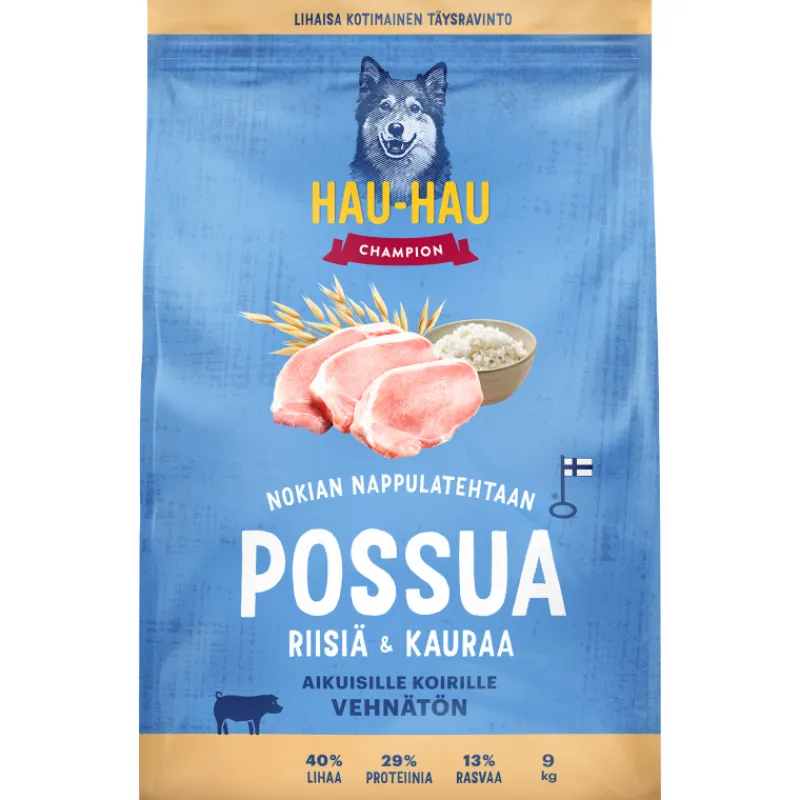 Suomalainen Hau-Hau Champion possua, riisiä ja kauraa on maistuva ja lihaisa kuivaruoka. Vehnätön täysravinto sisältää suomalaisilla maatiloilla kasvanutta possunlihaa 40 %. Possu on ravinnon ainoa eläinproteiininlähde, josta koira saa B-vitamiinia ja muita elimistön tärkeitä rakennusaineita.