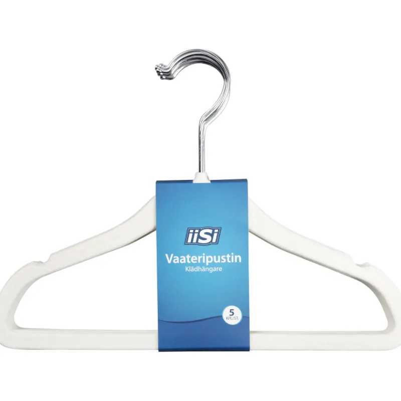 Iisi lasten vaateripustin on samettipintainen, vaatteille hellävarainen säilytyshenkari. Samettipinta estää vaatteita liukumasta henkarilla. Ripustimen koko 30 x 0,6 x 20 cm. Pakkauksessa on 5 kpl ripustimia. Eri värejä.