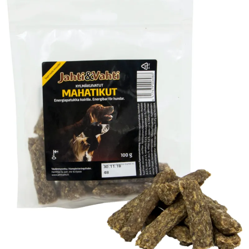 Kotimainen Jahti&Vahti mahatikku on viljaton, kylmäkuivattu energiapatukka koirille sekä kissoille. Kylmäkuivaus säilyttää lihan maut ja aromit tuoreen veroisina, joten mahatikku maistuu nirsoimmillekin koirille. Se sisältää runsaasti energiaa ja proteiinia.