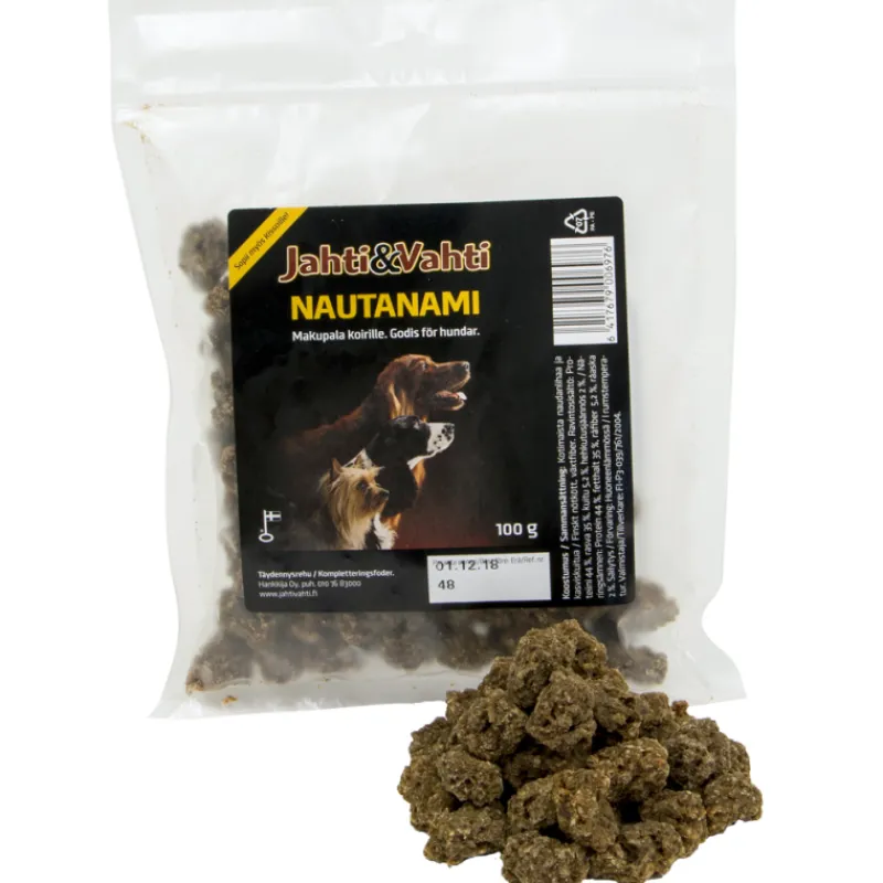 Kotimainen Jahti&Vahti Nautanami on viljaton ja lihaisa makupala koirille ja kissoille. Se sisältää ainoastaan yhtä eläinproteiinia, lämpökuivattua kotimaista nautaa. Näin allergeenien välttäminen on helppoa. Maku tulee luonnollisesti lihasta.