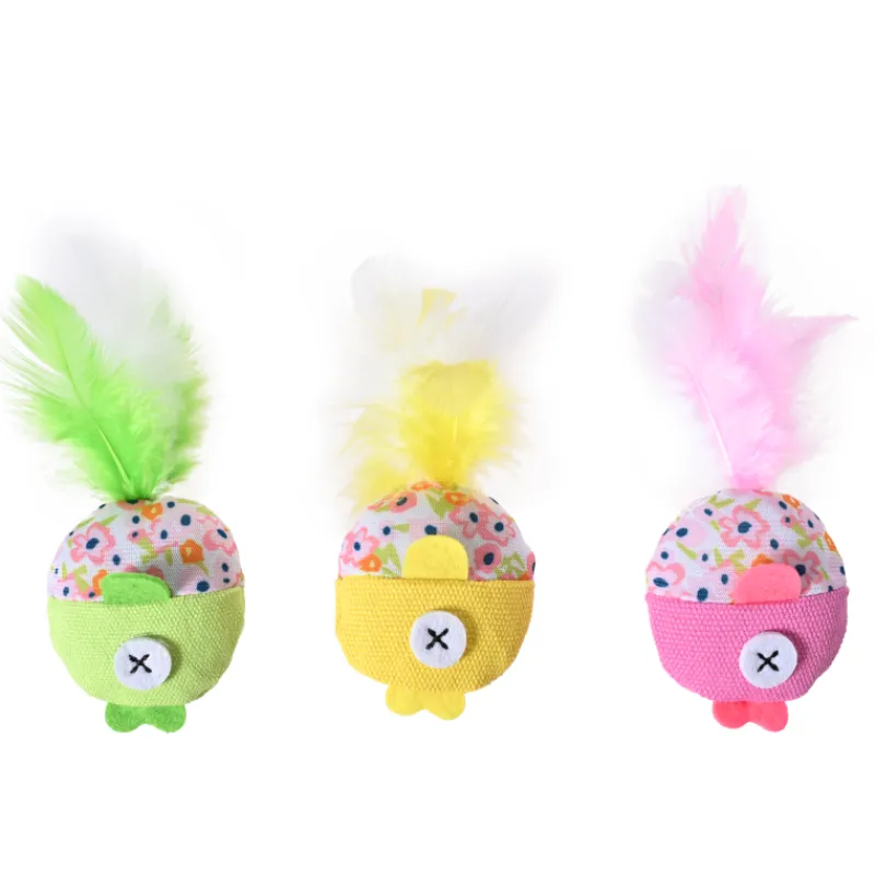 Kolme höyhenhäntäistä pikkukalaa ovat valmiita vauhdikkaisiin leikkeihin. Lelukalojen sisällä on kissanminttua. Koko n. 5 cm.