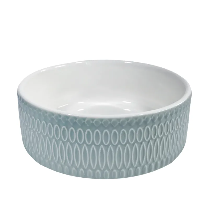 Keraaminen lemmikin ruokakuppi sopii niin ruokintaan kuin vesikupiksi. Reunaa kiertää tyylikäs kohokuvio. Kulhon voi pestä astianpesukoneessa.