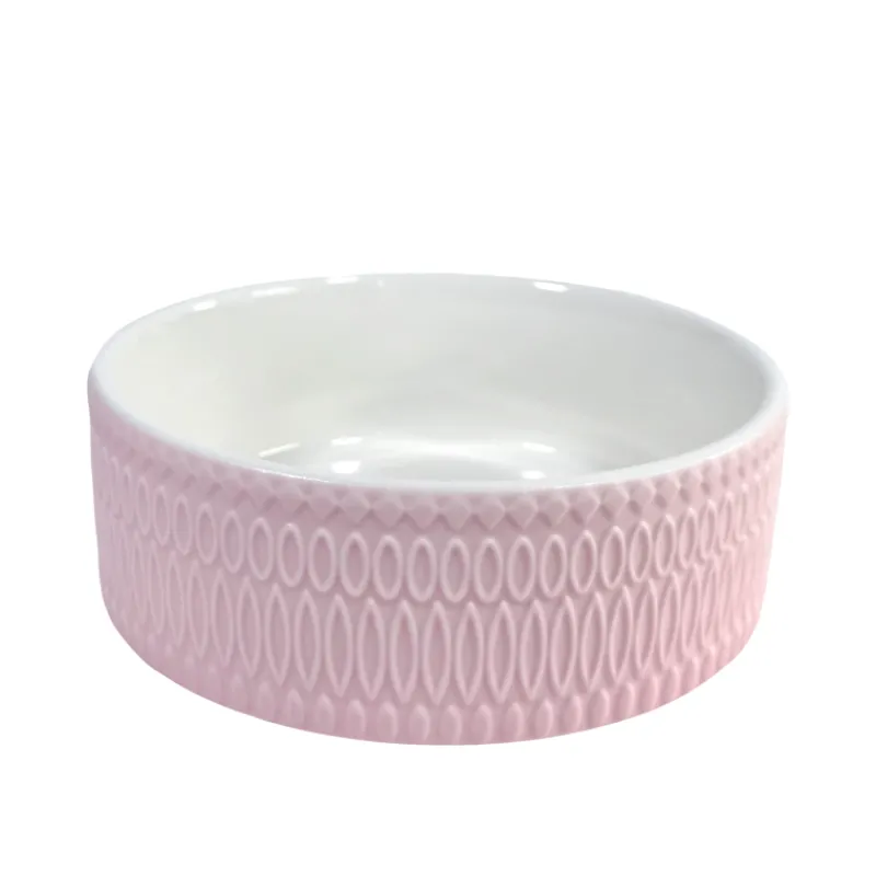 Keraaminen lemmikin ruokakuppi sopii niin ruokintaan kuin vesikupiksi. Reunaa kiertää kaunis kohokuvio. Aterian jälkeen kulhon voi pestä astianpesukoneessa.