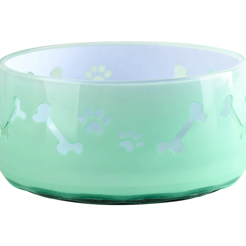 Mintunvihreä Jalo koiran ruokakuppi, jonka reunassa kiertää läpikuultava luu- ja tassukuviointi. Pohjan liukuesterengas pitää kupin paikoillaan. Lemmikin kuppi on helppo pestä astianpesukoneessa.