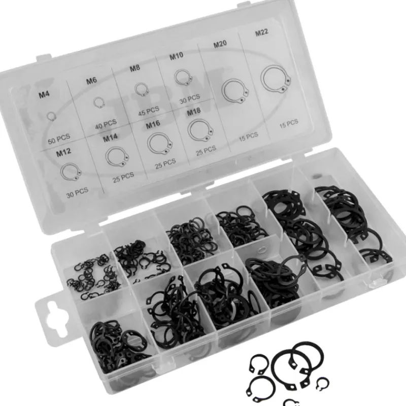 300 osainen ulkopuolinen lukkorengaslajitelma ø4-22 mm. Sisältää 50kpl ø4mm, 40kpl ø6mm, 45kpl ø8mm, 30kpl ø10mm, 30kpl ø12mm, 25kpl ø14mm, 25kpl ø16mm, 25kpl ø18mm, 15kpl ø20mm ja 15kpl ø22mm.