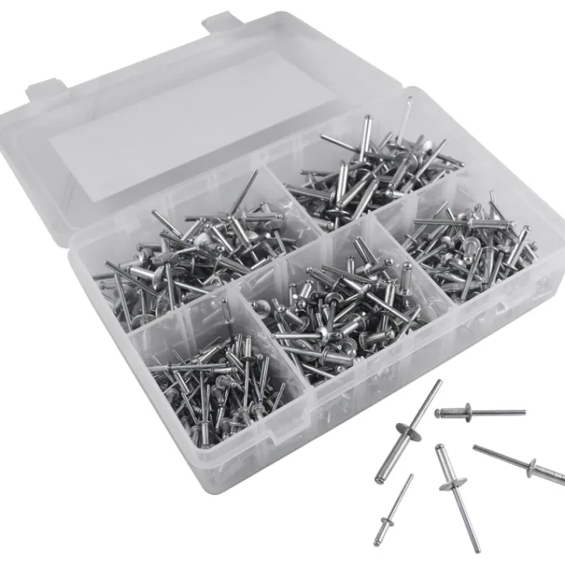 Alumiini vetoniittilajitelma 3.2-4.8 mm 300 osaa. Sisältää: 3,2x 9,70mm – 90 kpl, 4,8x 16,90mm – 50 kpl, 4,8x 24,80mm – 40 kpl, 4,8x 12,70mm – 70 kpl, 4,8x 20,00mm – 50 kpl.