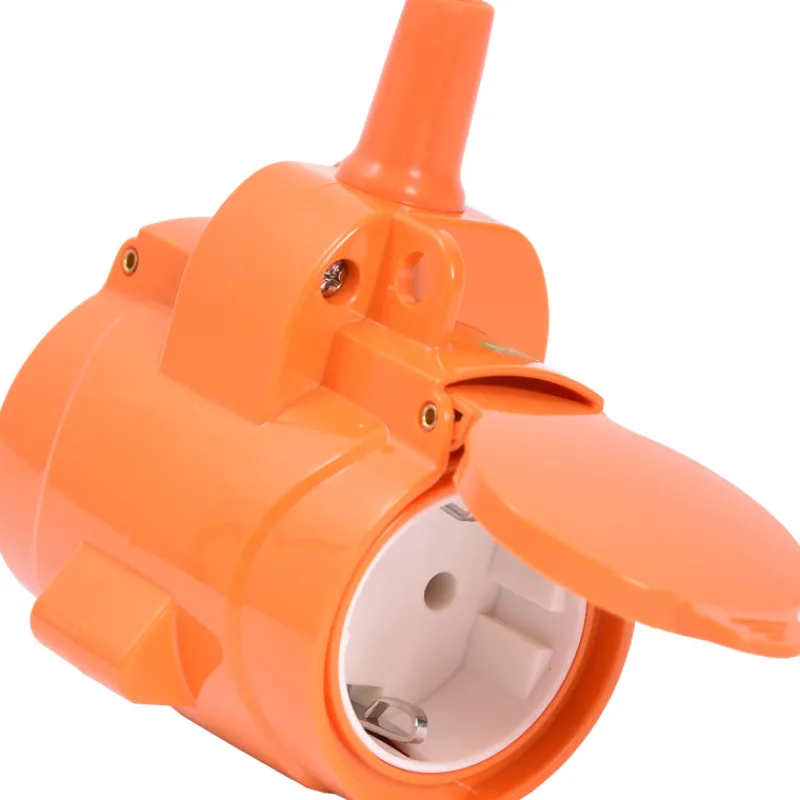 Jatkopistorasiassa on tynnyripää ja on kaksi rasiaosaa, jotka on suojattu avattavalla kannella. Suojausluokka on IP44, joten tuote sopii myös ulkokäyttöön.