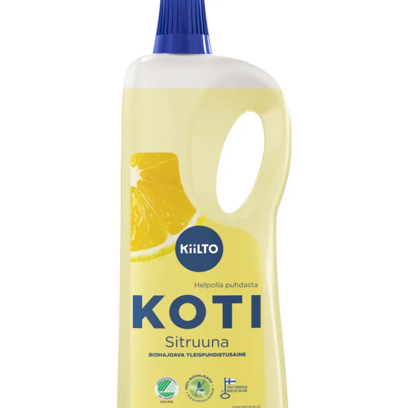 Kiilto Koti Sitruuna Biohajoava Yleispuhdistusaine on raikkaan sitruksisen tuoksuinen yleispuhdistusainetiiviste. Se puhdistaa tehokkaasti kaikki kodin pesunkestävät pinnat, kuten lattiat, ovet ja kalusteet, jättäen jälkeensä miellyttävän tuoksun ja puhtaan raikkaan kodin. Yleispuhdistusaine soveltuu myös kosteiden tilojen sekä rasvan ja lian puhdistukseen.