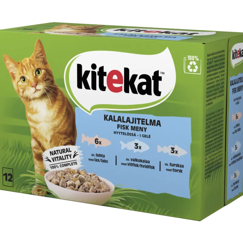 Kitekat annospussista tarjoat kissallesi maukkaan kalanmakuisen aterian. Herkullinen Kitekat kalastajan kalaherkut hyytelölajitelma on valmistettu laadukkaista raaka-aineista. Kalalajitelma on kypsennetty hellävaraisesti, ja näin kerta-annospussit pitävät sisällään kissalle tärkeitä ravintoaineita. Pakkaus sisältää 3 erilaista makua: lohta, valkokalaa ja turskaa.