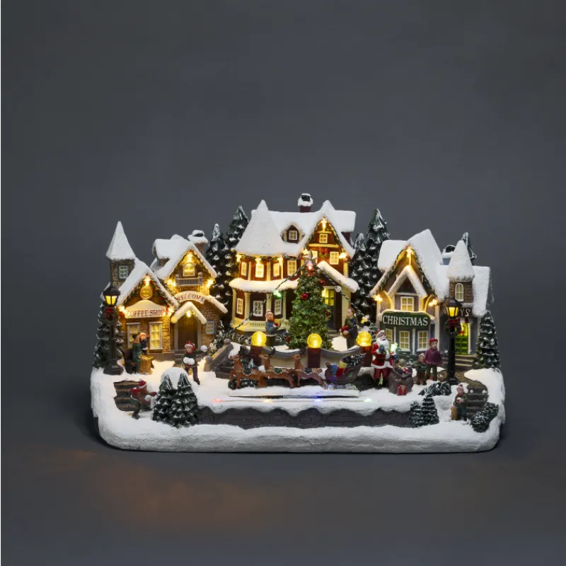 Koriste toimii 4,5 V 3,6 W muuntajalla (sisältyy pakkaukseen) tai 3 x AA-paristoilla (ei sis. pakkaukseen, ostettavissa erikseen). Ajastin: toiminta-aika 6 h, käynnistyy automaattisesti uudelleen 18 h kuluttua. Koristeen mitat 44 x 25,5 x 23 cm, materiaali polyresiiniä.