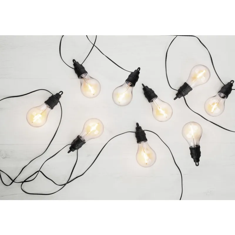 Kotikulta Party -valosarjassa on 8 lämpimän valkoista LED-lamppua 71,5 cm välein. IP44 suojattu muuntaja 3,5V / 2,4W.