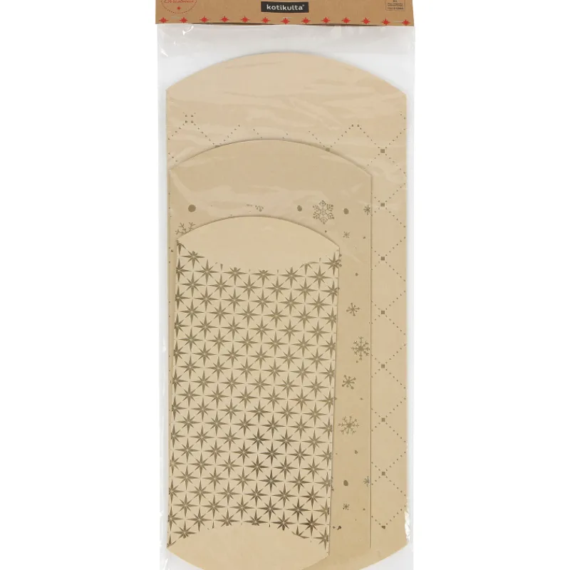 Kätevät kuosilliset Kotikulta-lahjalaatikot joululahjoille. Pakkaus sisältää kolme erikokokoista laatikkoa: 44 x 23 cm, 36,5 x 19,2 cm ja 30 x 15,5 cm.