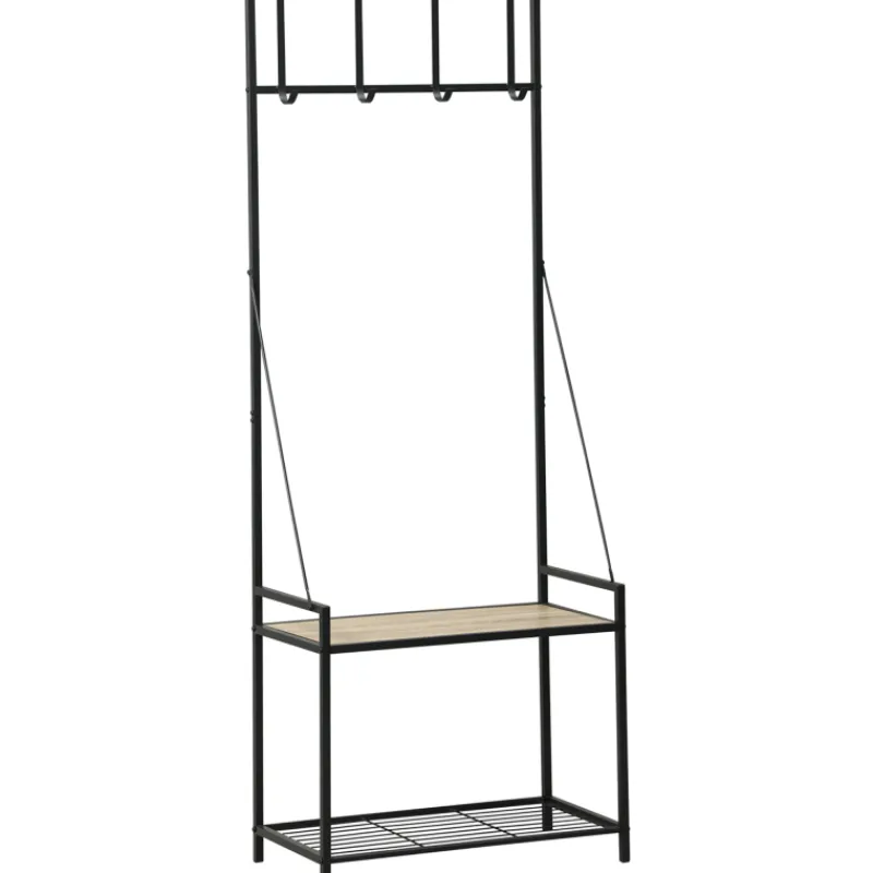 Kotikulta Hobro -naulakko tarjoaa säilytystilaa niin ulkovaatteille kuin kengillekin. Naulakossa on neljä koukkua, lastulevyhylly tammikuvioinnilla sekä kenkäritilä. Naulakon runko on metallia.