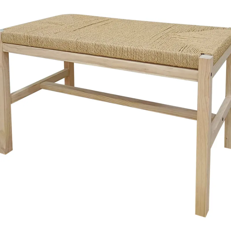 Kotikulta Kuusamo -penkki kauniissa vaalean puun sävyssä. Penkin runko on luonnollisen sävyistä mäntyä ja sen istuinosa on punottu kestävästä paperinarusta.