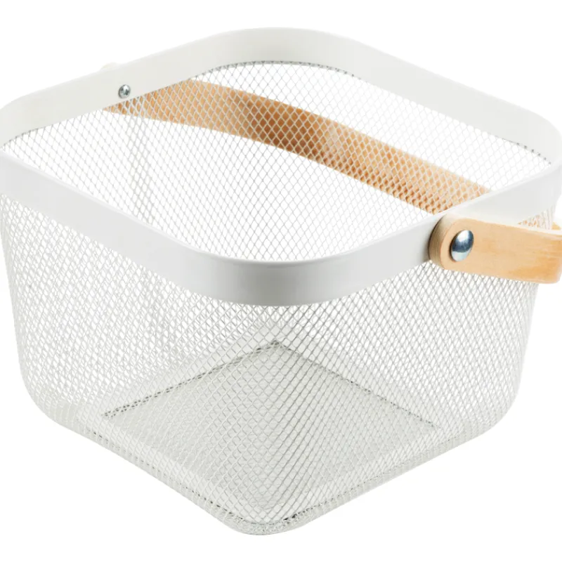 Valkoisen korin koko on 26 x 24,5 x 30 cm. Materiaali on metallia ja puuta.