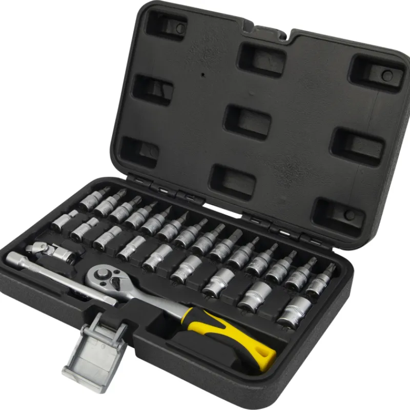 - 14 kpl 1/4″ kärkihylsyjä, mukaan lukien: 3 kpl ura: SL4-SL5-SL6, 3 kpl Phillips: PH1-PH2-PH3, 3 kpl kuusio: H4-H5-H6, 5 kpl Torx: T10-T15-T20-T25-T30, 1 kpl 1/4″ nivelliitin, 1 kpl 1/4″ 72-hampainen pikavapautusräikkä, 1 kpl 1/4″ jatkovarsi (pituus: 100 mm)